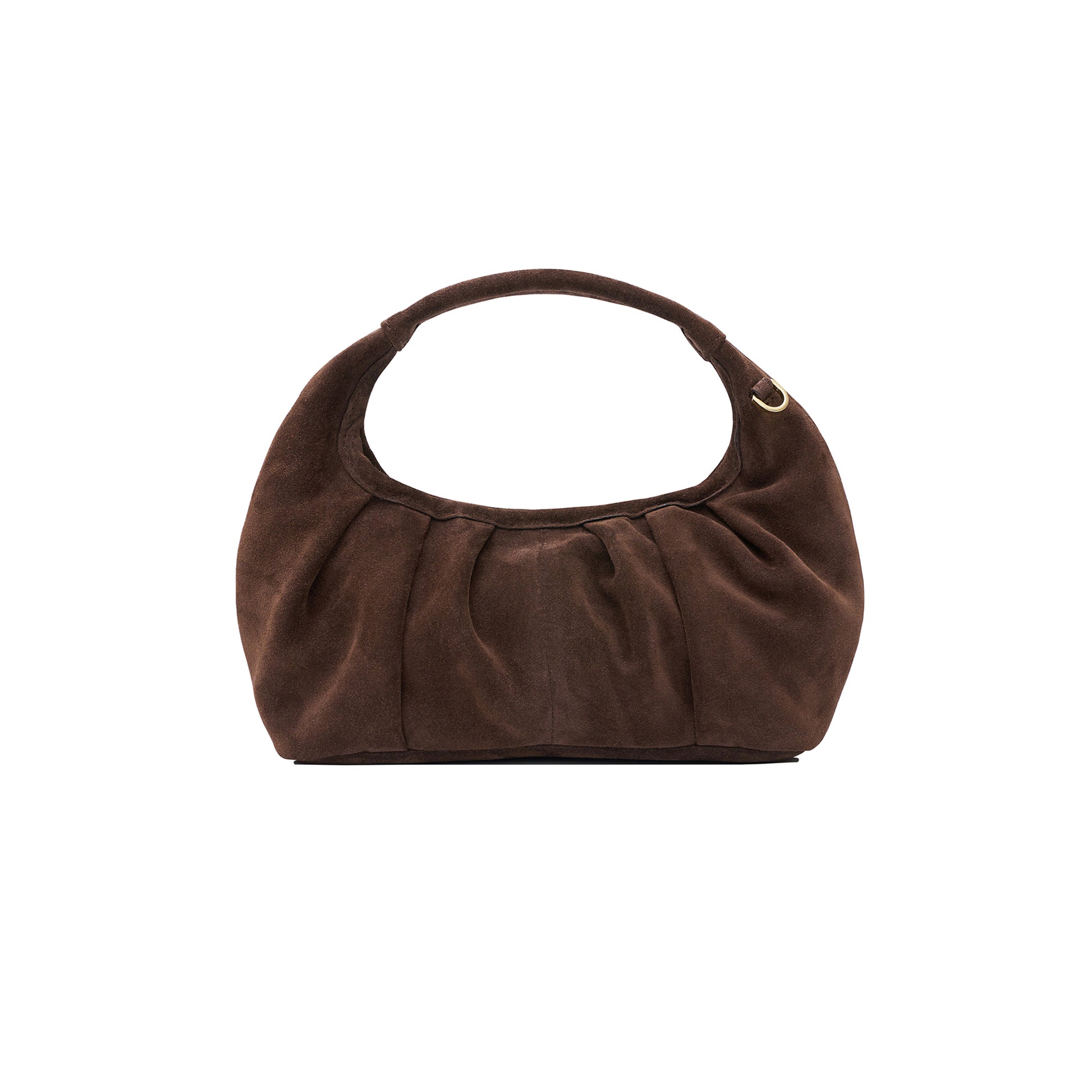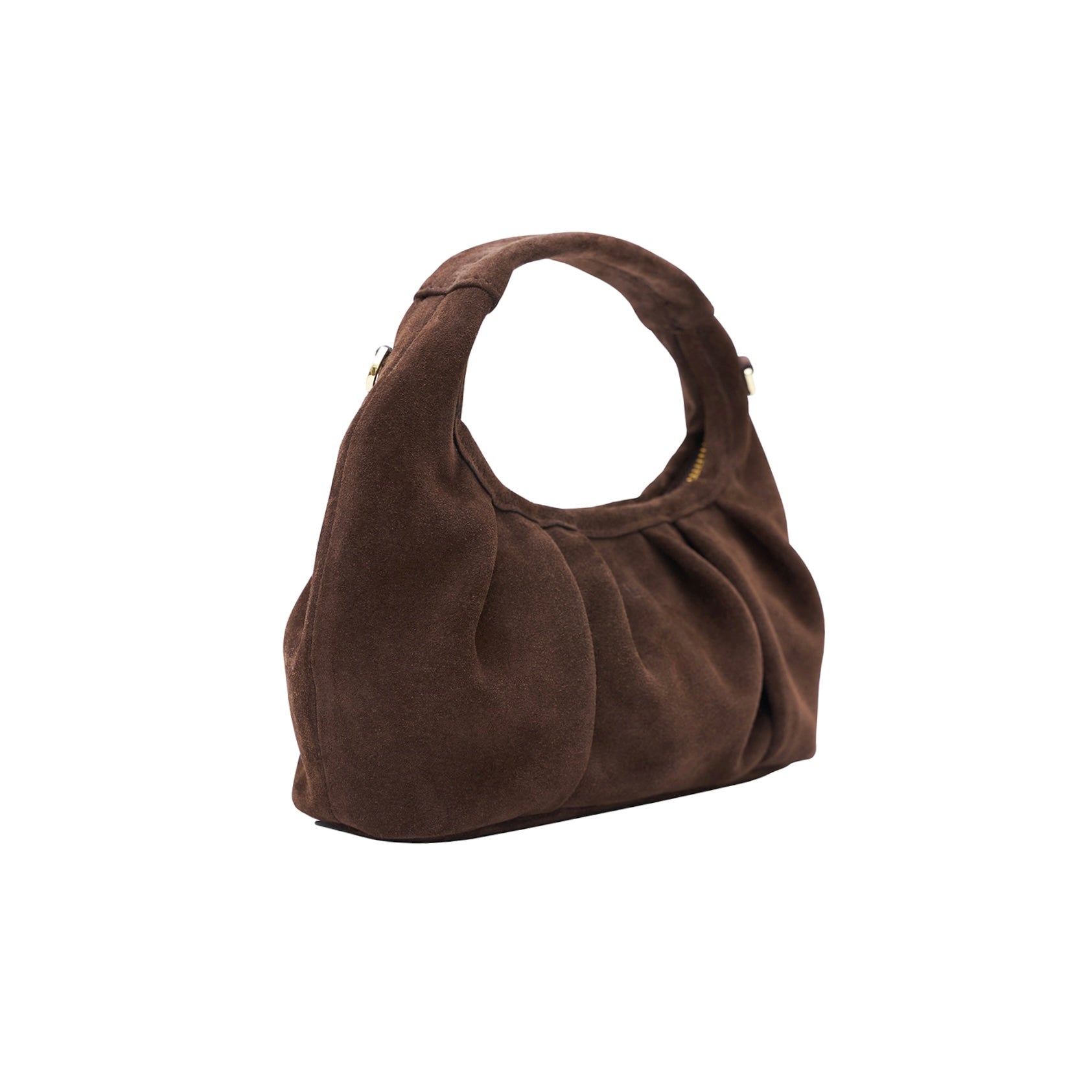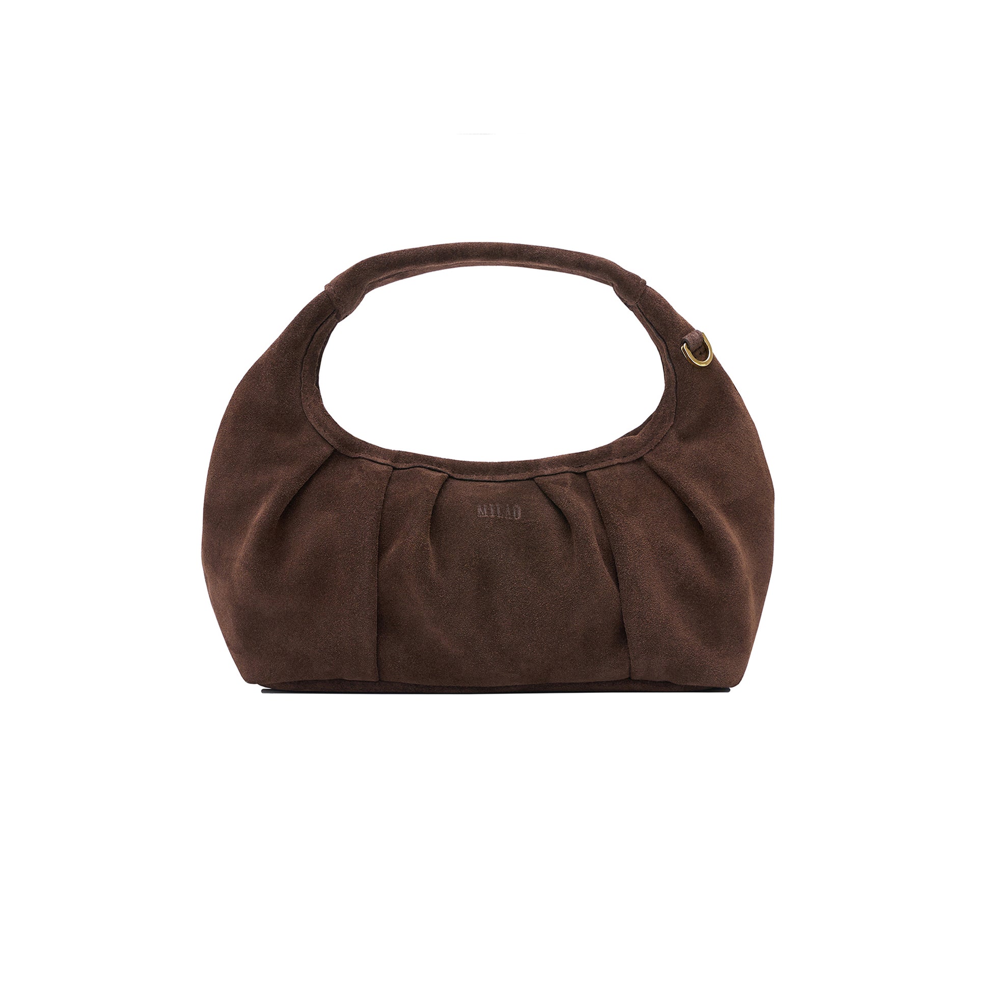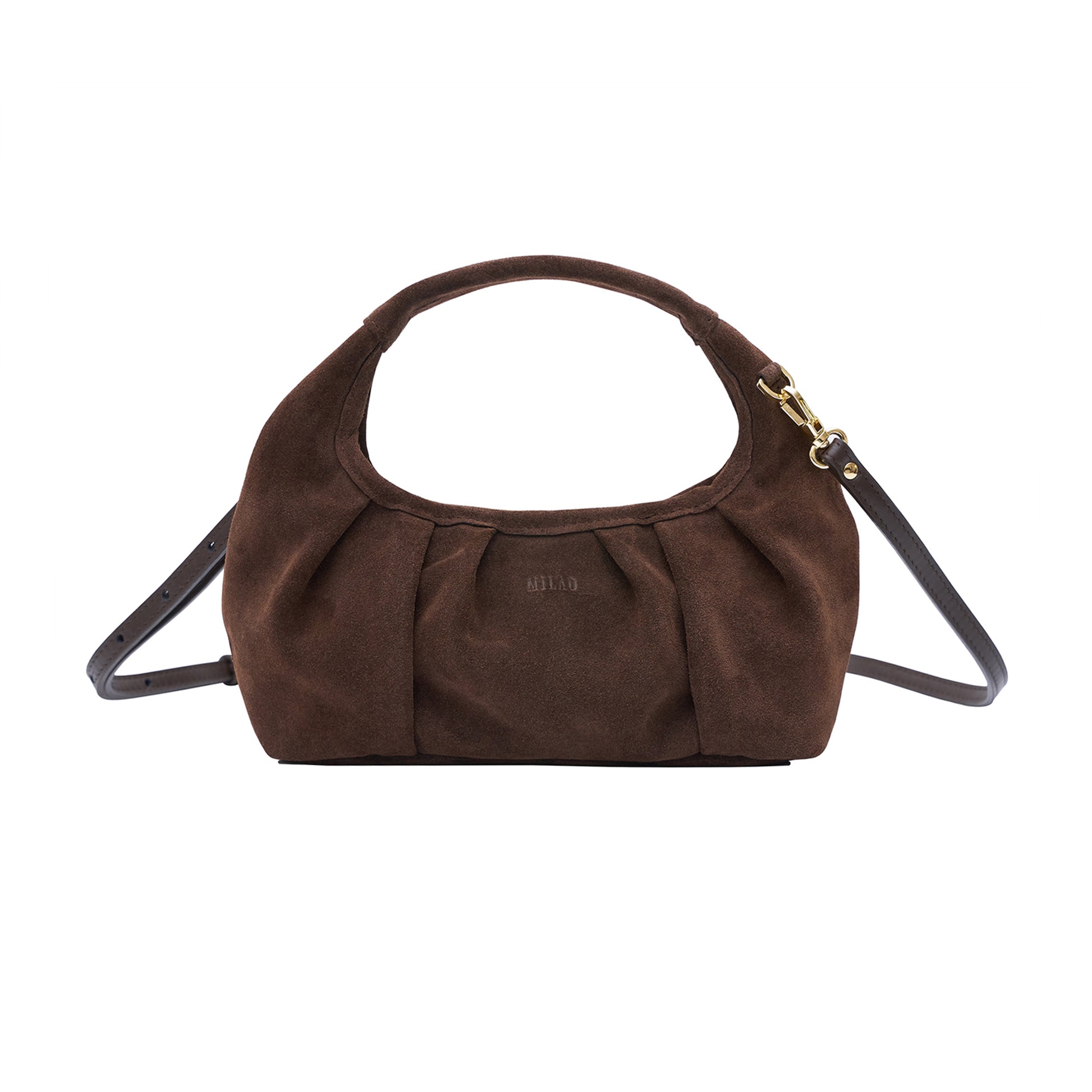 MIA to niewielka torebka w stylu hobo do noszenia w dłoni, na ramię lub przez ciało. Sprawdzi się idealnie jako torebka na co dzień czy na wieczorne wyjścia. Zakładki na korpusie dodają jej charakteru i wyrazistości. Torebka została wykonana z naturalnej, włoskiej skóry zamszowej w kolorze brązowym (czekoladowym). Środek torebki wykończony jest czarną, bawełnianą podszewką. Mia posiada jedną otwartą kieszonkę. Zamykana jest na suwak. W zestawie z długim paskiem regulowanym na knopik. Złote okucia.